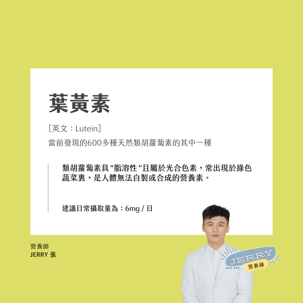 葉黃素(Lutein)是一種天然的 類胡蘿蔔素(Carotenoid),屬於「葉黃素與玉米黃素(Lutein & Zeaxanthin)」群組,是眼睛保健中非常重要的營養素。它本身不能由人體自行合成,必須透過食物或營養補充品攝取。